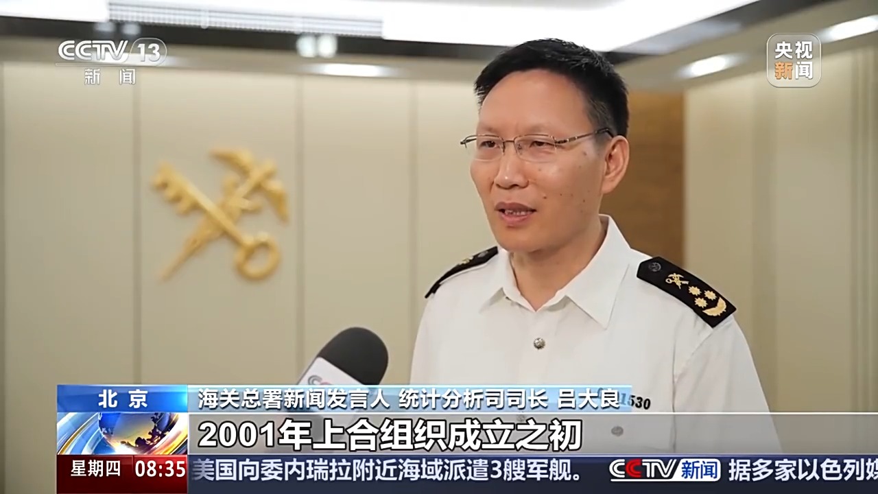 海关总署新闻发言人 统计分析司司长 吕大良:2001年上合组织成立之初,我国对其他成员国进出口规模1000亿元,2024年已经攀升到36500亿元,增长了30多倍。