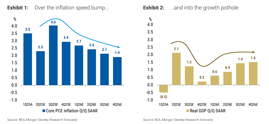 摩根士丹利经济学家基线预测描绘了一个清晰的关税冲击时间线:关税将在2025年三季度推高通胀(通胀减速带),随后立即在四季度拖累经济增长(增长坑洼)。